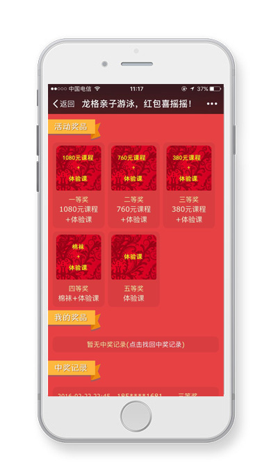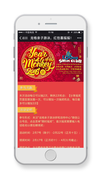龍格親子游泳呼和浩特中心微信平臺2016年舉辦的春節(jié)活動,紅包喜搖搖。呼搜網(wǎng)為其提供活動策劃、微網(wǎng)站開發(fā)、微信支付、支付寶支付、店內(nèi)卡卷消費、微砍價等一系列活動,為該店鋪帶來了諸多線下客戶。