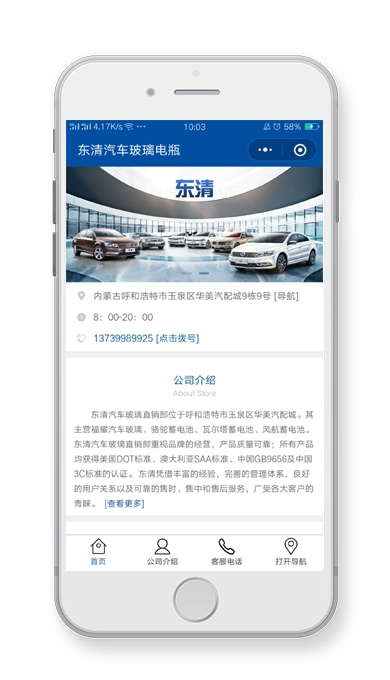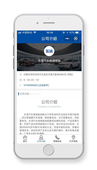 東清汽車玻璃電瓶小程序向用戶展示了公司介紹,產(chǎn)品詳情、產(chǎn)品優(yōu)惠政策、以及一鍵撥號、一鍵導(dǎo)航等服務(wù),呼搜網(wǎng)從策劃到開發(fā)上線全程提供服務(wù)。