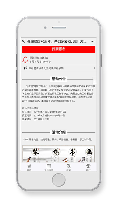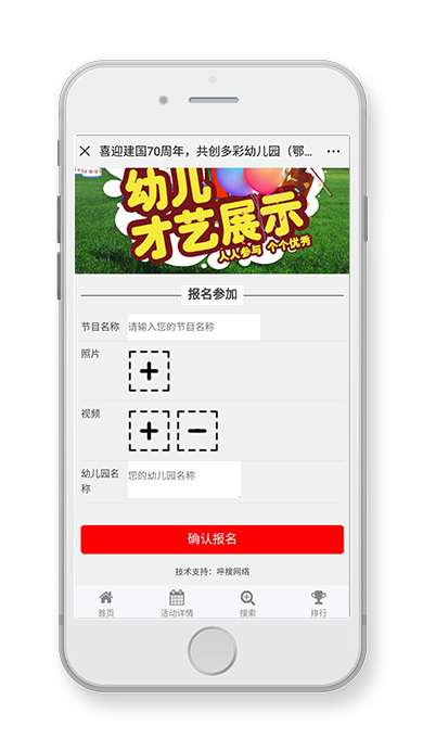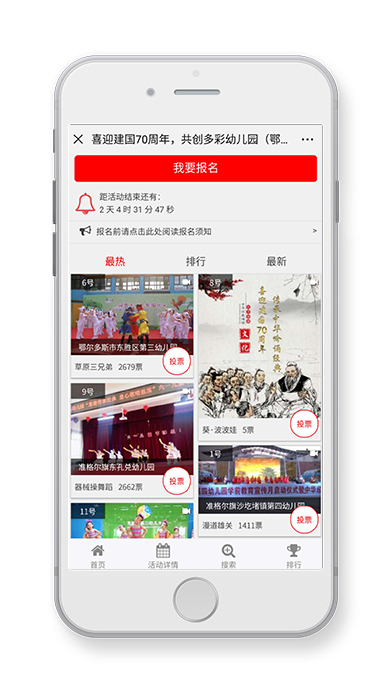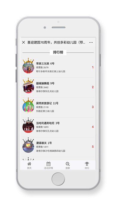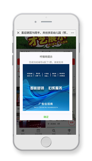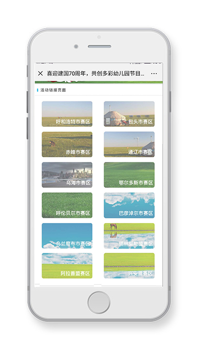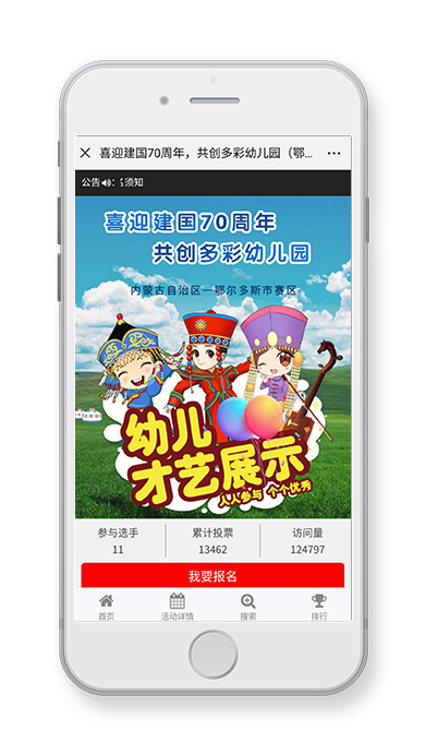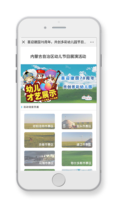 內(nèi)蒙古幼教協(xié)會(huì)“喜迎建國70周年,共創(chuàng)多彩幼兒園節(jié)目展演”線上投票活動(dòng),呼搜網(wǎng)為其提供微信平臺技術(shù)支持,本次投票活動(dòng)調(diào)動(dòng)了兒童的積極性,同時(shí)向兒童傳遞了愛國思想。