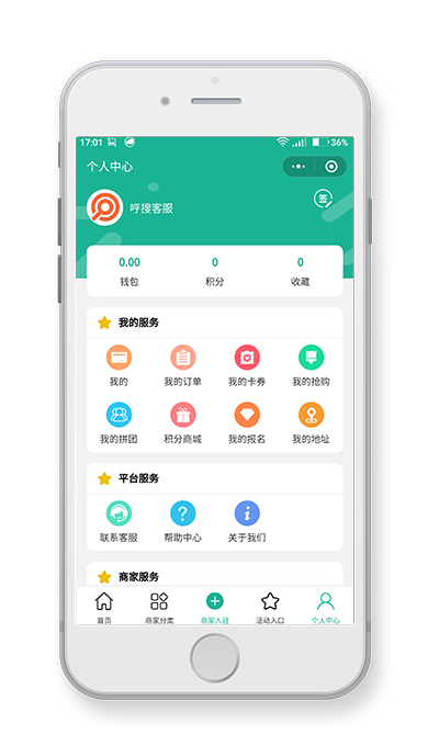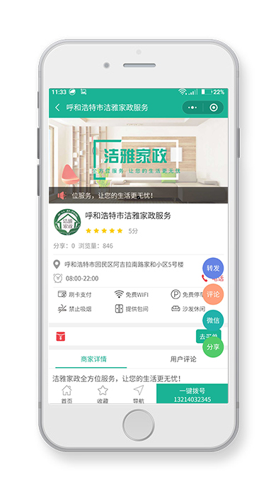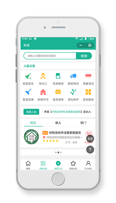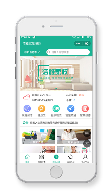 潔雅家政服務(wù)小程序最大功能是可以多家家政行業(yè)公司入駐到小程序里,行業(yè)分類全面,小程序首頁界面時刻體現(xiàn)天氣、瀏覽量、時間、公告等信息,商家頁面還有產(chǎn)品展示、商家電話、距離、導(dǎo)航、微信客服等,非常方便。入駐小程序的商家還可以擁有自己的手機端后臺發(fā)布優(yōu)惠商品、折扣、滿減、團購、優(yōu)惠券等,這款小程序的功能非常強大;呼搜網(wǎng)從策劃到開發(fā)上線全程提供服務(wù)。