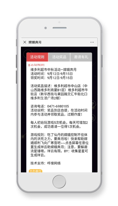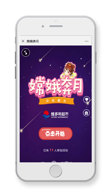 維多利超市中秋時(shí)節(jié)限時(shí)活動(dòng)——嫦娥奔月營(yíng)銷小游戲,通過游戲獲得優(yōu)惠券/禮品券可到指定店鋪領(lǐng)取,本活動(dòng)由呼搜網(wǎng)絡(luò)提供技術(shù)支持。