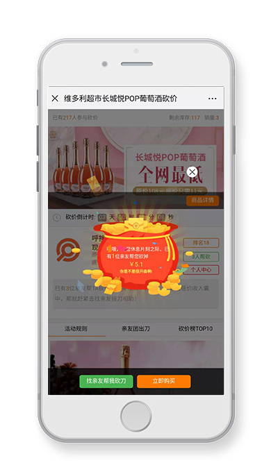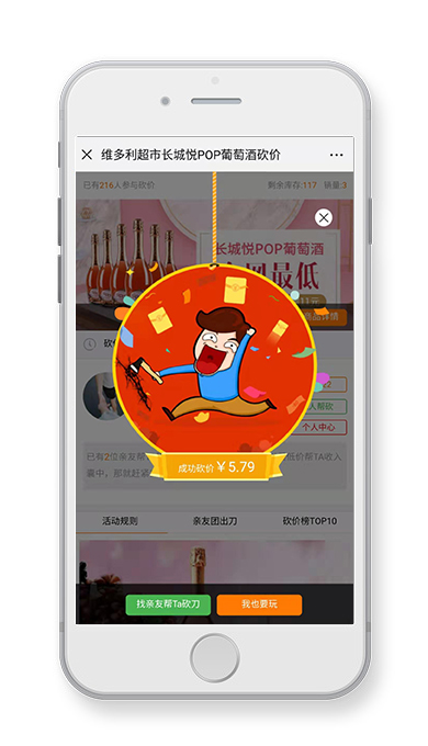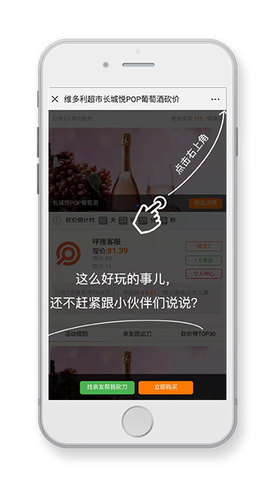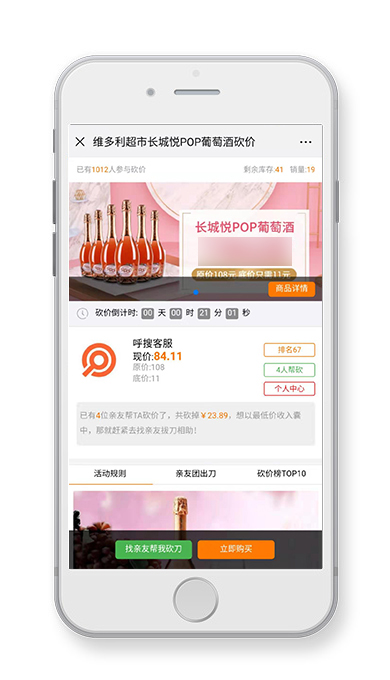 雙11期間,維多利超市推出“長城悅POP葡萄酒”砍價活動,活動將原價108元的葡萄酒通過好友助力砍價方式以低至11元價格到店購買,進入鏈接即可參與。本活動由呼搜網(wǎng)絡(luò)提供技術(shù)支持。