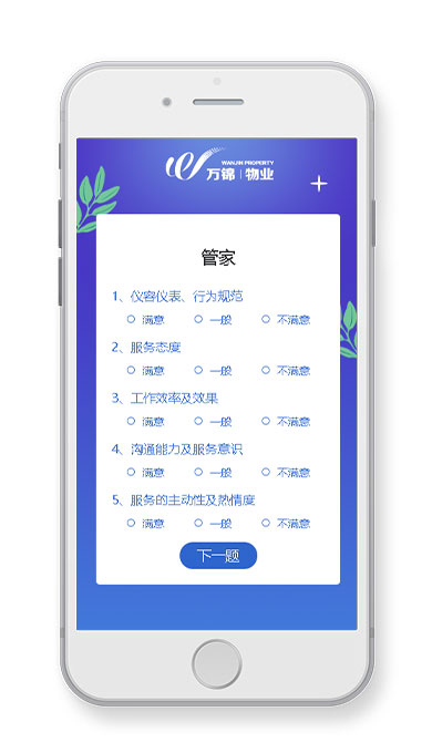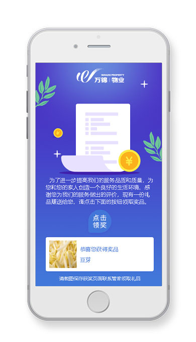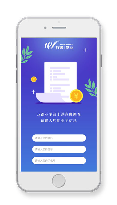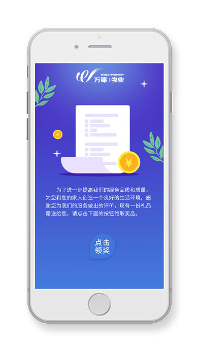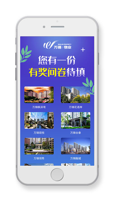 呼和浩特市頂級物業(yè)—萬錦物業(yè)制作有獎問卷調(diào)查回饋新老業(yè)主,調(diào)查問卷首先輸入業(yè)主信息(小區(qū)名稱、房號、姓名、手機(jī)號),歸類小區(qū)業(yè)主,調(diào)查問卷的題目可后臺自行輸入(滿意、一般、不滿意),以及文字描述問題;答題后可點(diǎn)擊按鈕抽獎,獎品由萬錦物業(yè)提供,后臺上傳圖片、名稱、庫存、中獎率即可;呼搜網(wǎng)絡(luò)從策劃到應(yīng)用開發(fā)、上線全程提供服務(wù)。