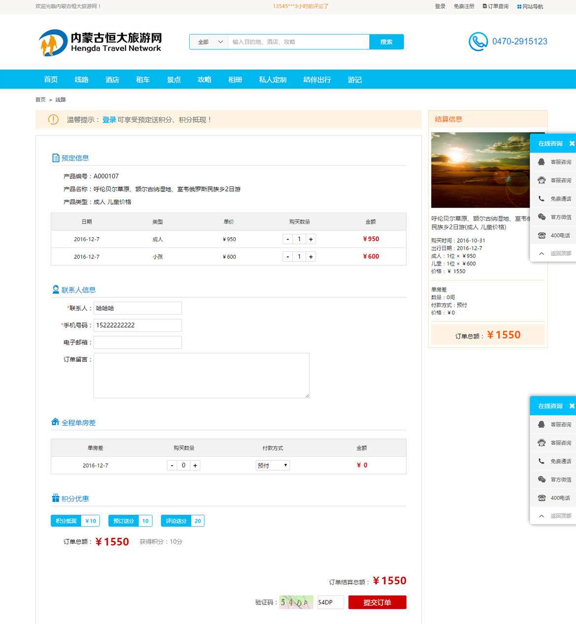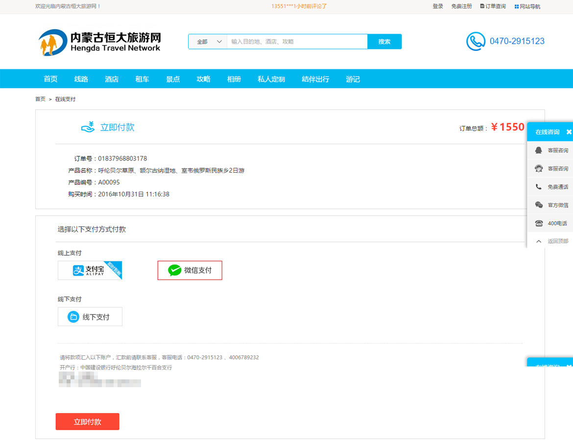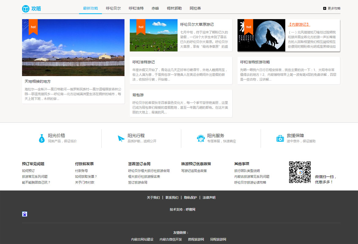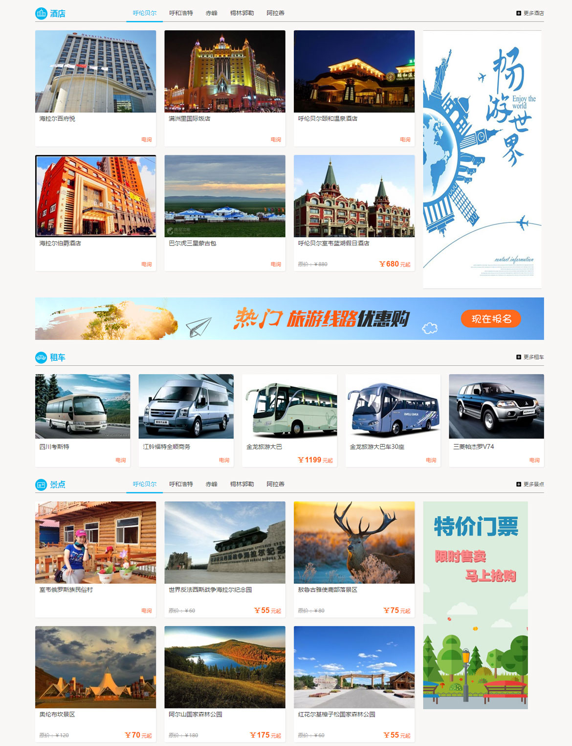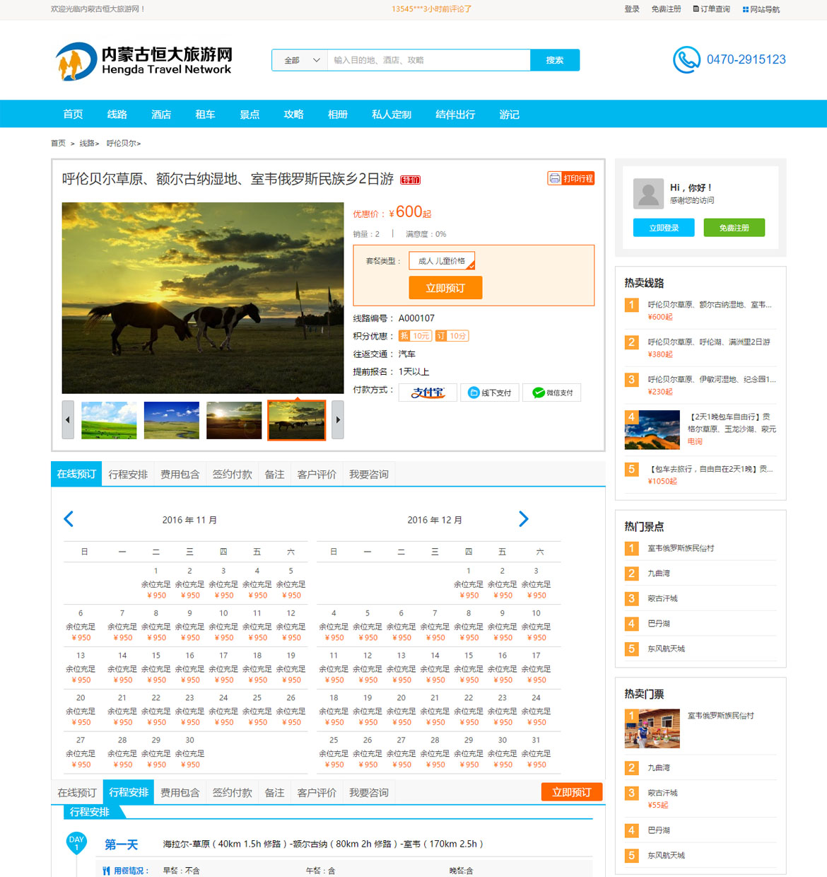 內(nèi)蒙古恒大旅游公司官方微網(wǎng)站,用戶可以直接在微信平臺(tái)預(yù)定各類旅游路線、景點(diǎn)、酒店、租車。并且有呼倫貝爾、呼和浩特、赤峰、錫林郭勒、阿拉善等多個(gè)站點(diǎn)支持。用戶可以直接在微信平臺(tái)付款購(gòu)買該網(wǎng)站的任何旅游產(chǎn)品,支持微信支付、支付寶支付等多種主流支付方式,呼搜網(wǎng)從策劃到開發(fā)上線全程提供服務(wù)。