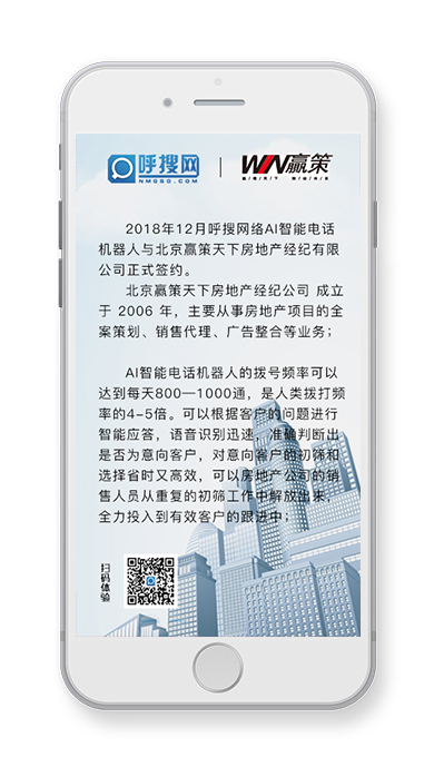 2018年12月呼搜網(wǎng)絡(luò)AI智能電話機器人與北京贏策天下房地產(chǎn)經(jīng)紀(jì)有限公司正式簽約。