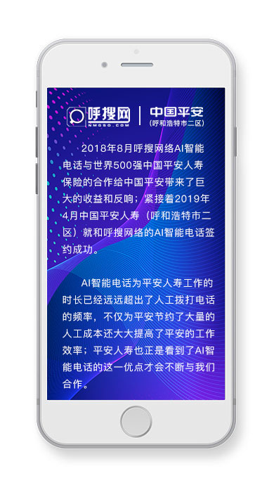 2019年4月呼搜網(wǎng)絡AI智能電話與中國平安人壽(呼和浩特市二區(qū))簽約成功。
