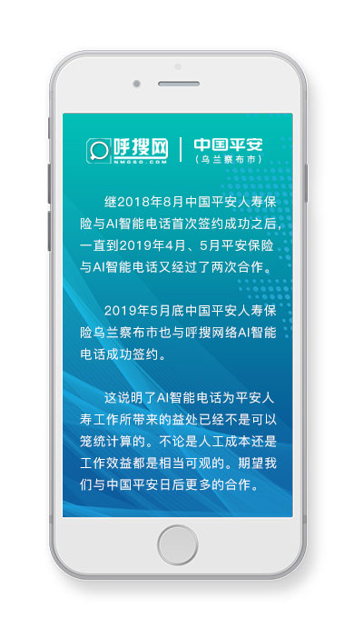 2019年5月底中國(guó)平安人壽保險(xiǎn)烏蘭察布市與呼搜網(wǎng)絡(luò)AI智能電話成功簽約。