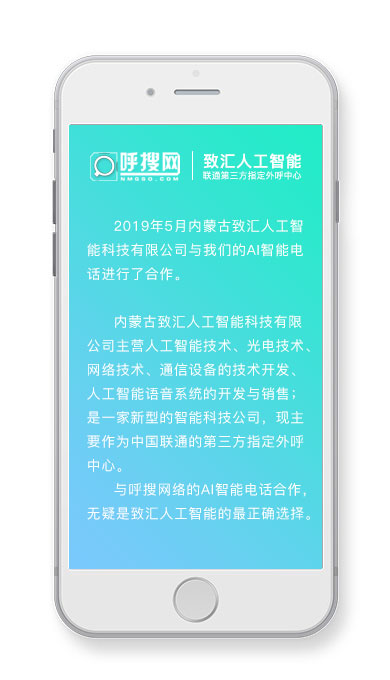 2019年5月內(nèi)蒙古致匯人工智能與AI智能電話合作,內(nèi)蒙古致匯人工智能科技有限公司主營人工智能技術(shù)、光電技術(shù)、網(wǎng)絡(luò)技術(shù)、通信設(shè)備的技術(shù)開發(fā)、人工智能語音系統(tǒng)的開發(fā)與銷售;是一家新型的智能科技公司,現(xiàn)主要作為中國聯(lián)通的第三方指定外呼中心。