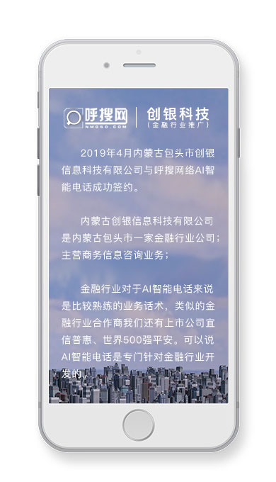 2019年4月呼搜網(wǎng)絡(luò)AI智能電話(huà)與內(nèi)蒙古創(chuàng)銀信息科技有限公司簽約成功。這是金融行業(yè)與AI智能電話(huà)的完美合作。